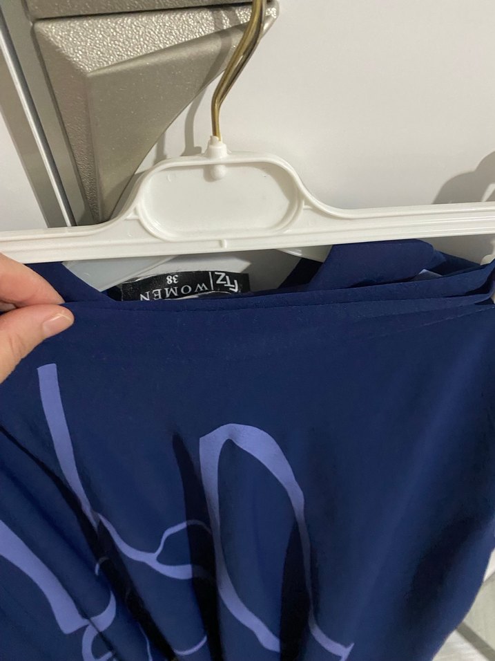 Lacivert baskılı, sentetik kumaştan, uzun kollu, yuvarlak yakalı, bol kesim Fermuar detayı ve günlük kullanım için uygun, sokak modası tarzında. Belinde seyyar kemeri de mevcuttur etek beli fermuarlı sadece bir kere özel günde giyildi.