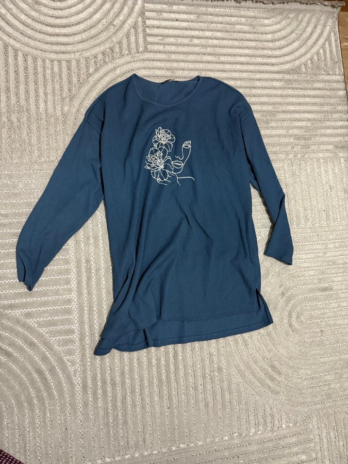 Lacivert renkte, uzun kollu ve yuvarlak yakalı hamile triko tişört. Önünde çiçek baskısı bulunur. Pamuklu örgü kumaştan, günlük kullanıma uygundur.