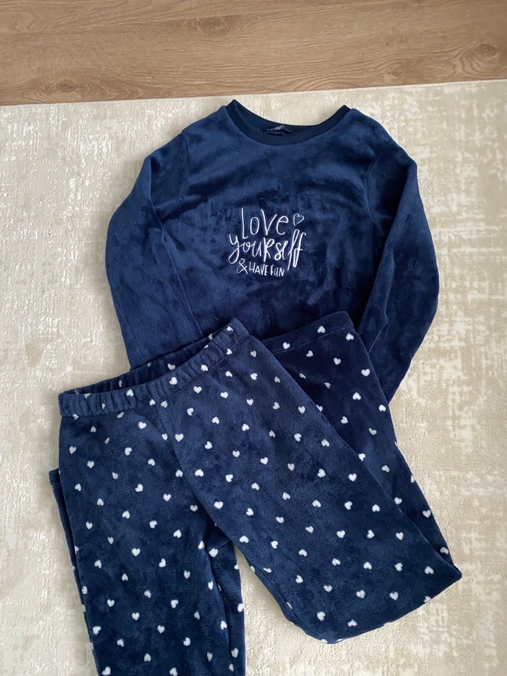 Lacivert pijama takımı, uzun kollu ve midi boyda, bol kesimdir. Üstte 'Love yourself' yazısı, pantolonda küçük kalp deseni bulunur. Rahat ve konforludur.
