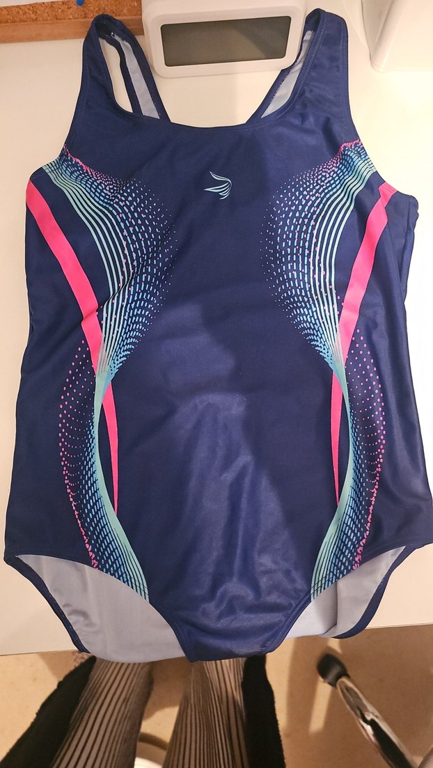 Lacivert zemin üzerine pembe ve açık mavi baskılı desenlerle tasarlanmış, elastik ve dar kesim kadın spor mayo. Çağdaş tarzda, spor için uygun. ♀️