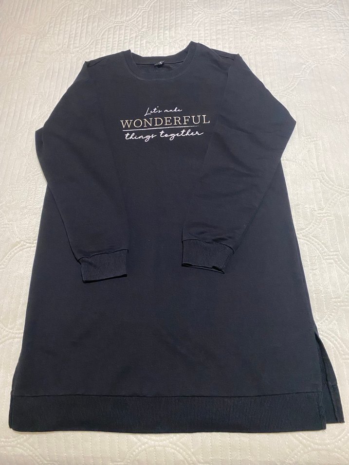 Siyah renk, uzun kollu, bisiklet yaka ve bol kesim kadın sweatshirt elbise. Önünde 'WONDERFUL' yazılı baskı bulunur, yumuşak sentetik kumaştan yapılmıştır.