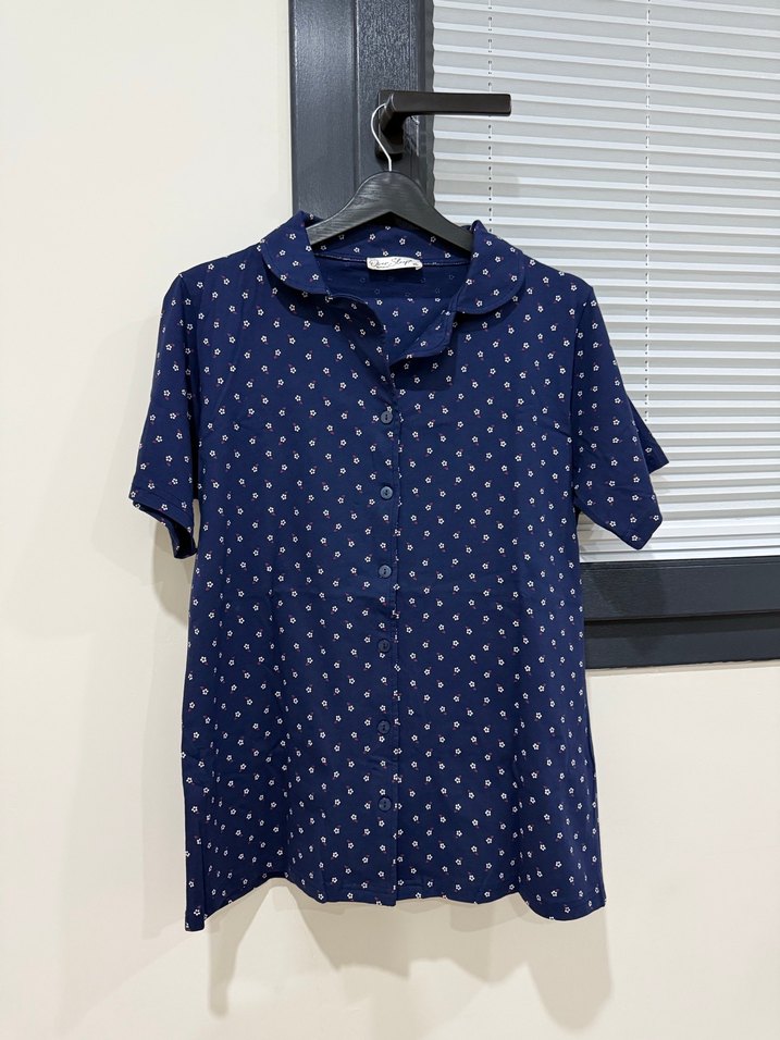 Lacivert pamuk kumaştan, baskılı desenli, kısa kollu, düğmeli ve yakalı pijama takımı alt üst . Hiç kullanılmadı yeni etiketli over sleep markalı