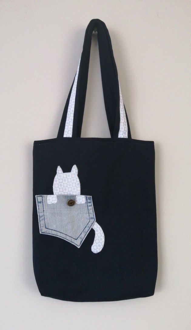Lacivert kot kumaş kadın çanta, baskılı kedi deseni ile günlük sokak stiline uygun minimalist tasarım.