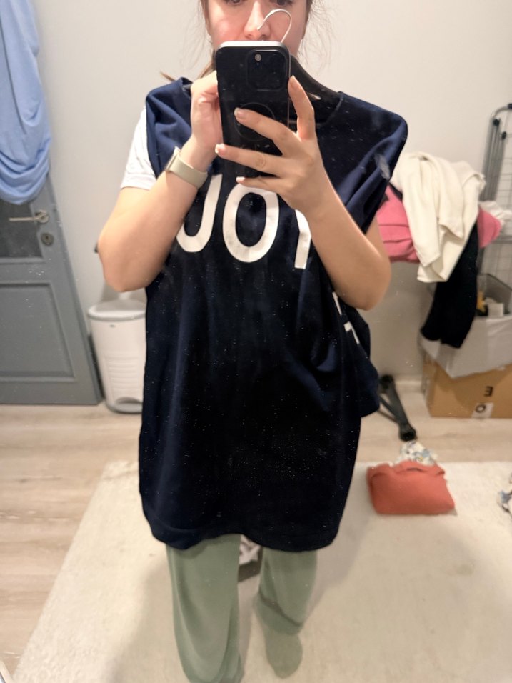 Lacivert baskılı, yüksek yakalı, kolu olmayan, bol kesim midi tişört Denim kumaştan, günlük rahat ve şık bir görünüm sunar. Hamile diye çıkıyor ama hamile reyonu değil