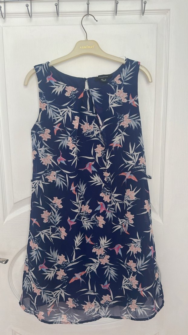 Lacivert renkli, çiçek desenli, kolsuz, V yakalı ve salaş kesimli mini elbise, günlük rahat kullanım için uygundur.
