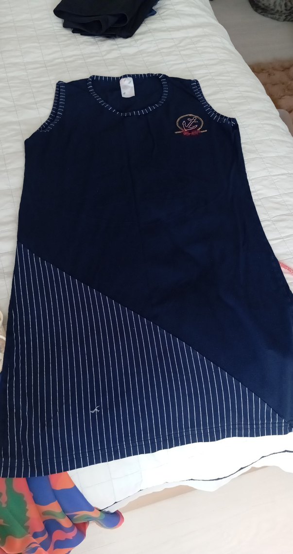 Lacivert renkli, baskılı desenli, alt kısmı çapraz çizgili olan, yuvarlak yakalı ve kolsuz mutfak önlüğü.