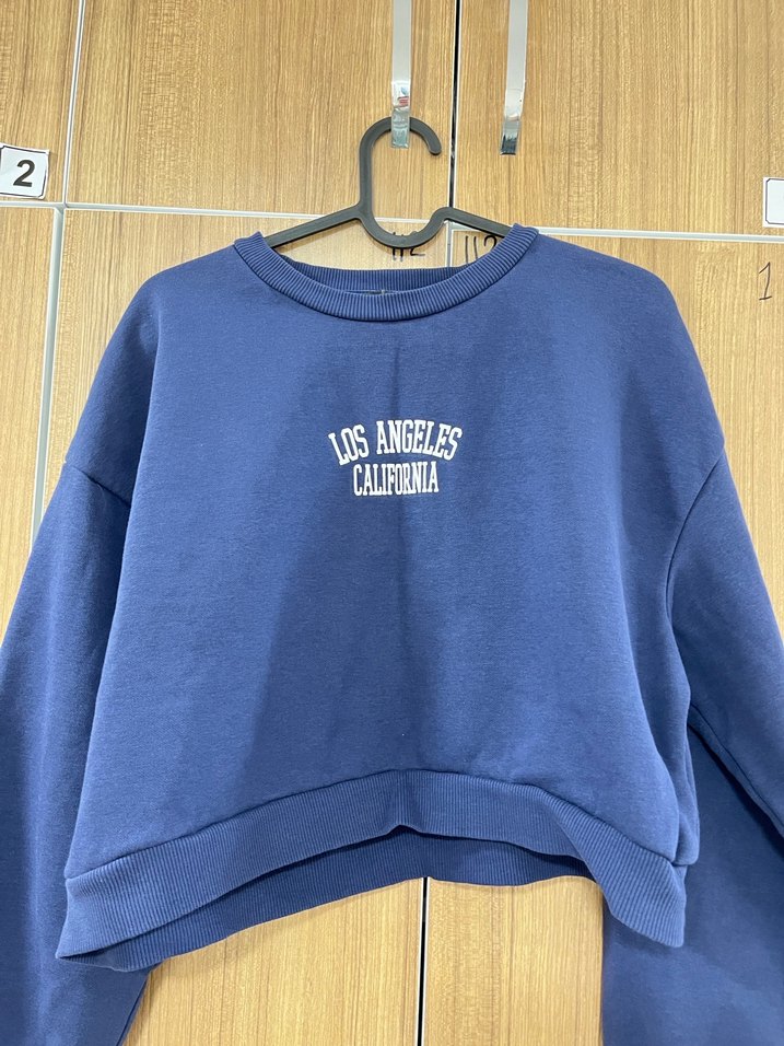 Lacivert denim kumaştan, yuvarlak yaka ve uzun kollu, bol kesim kadın sweatshirt. Önünde 'Los Angeles California' baskısı bulunur. Spor ve rahat tarz için uygun.