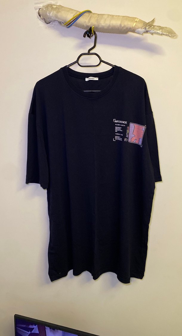 Kısa kollu, yuvarlak yakalı lacivert tişört, göğüs kısmında ve sırt kısmında baskılı detay bulunur. Rahat kesim ve yumuşak kumaştan üretilmiştir. Hiç giymedim.