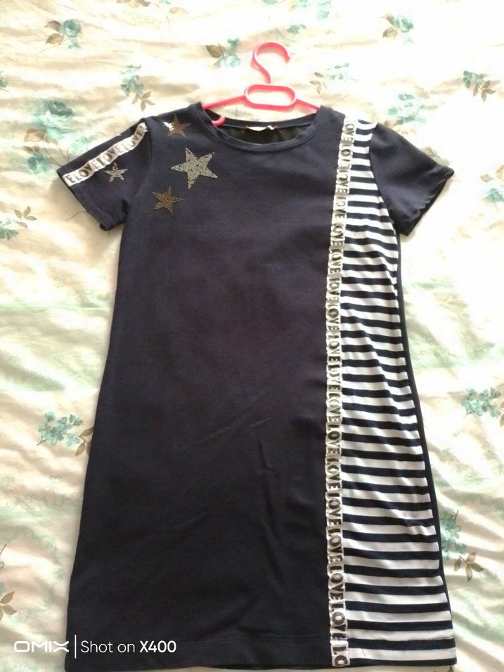 Kısa kollu, bisiklet yaka ve vücuda oturan kesime sahip lacivert midi elbise. Baskılı ve çizgili panellerle pilili detaylar ve dekoratif şeritler bulunur.