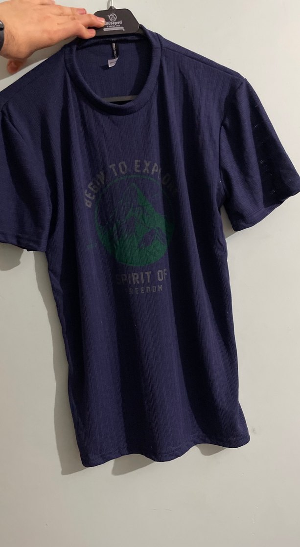 Lacivert renk, kısa kollu, bisiklet yaka tişört. Yumuşak ve sıcak kumaştan, rahat kesim. Üzerinde baskılı yazı ve desen bulunur.