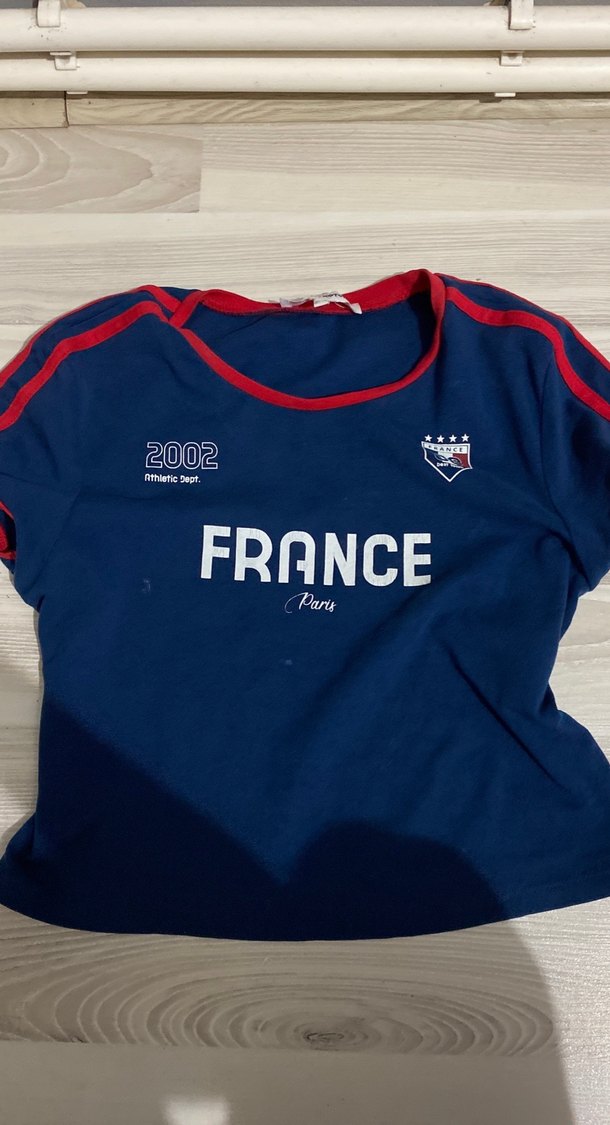 Dar kesim, yuvarlak yaka ve kısa kollu tişörtü, yumuşak ve sıcak kumaştan üretilmiştir. Baskılı desen ve dantel detaylarıyla spor ve günlük kullanıma uygundur. Lacivert renk ve 'France' yazısı sokak modası havası katar. ♀️