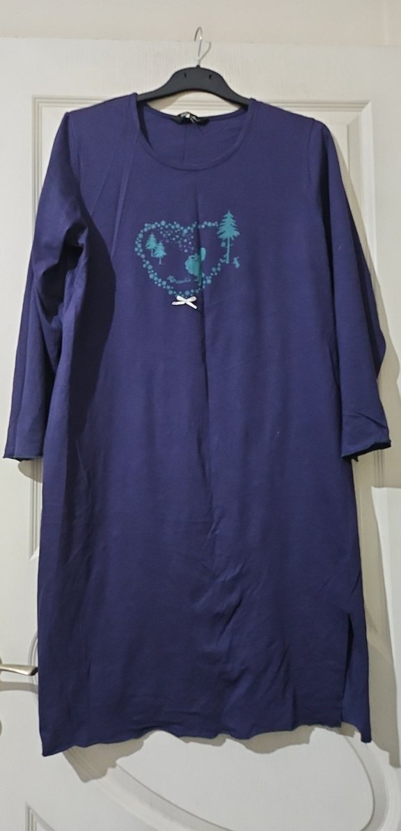 Lacivert renkli, uzun kollu, yuvarlak yaka ve bol kesim hamile geceliği, baskılı detaylarla uzun boyda tasarlanmıştır.