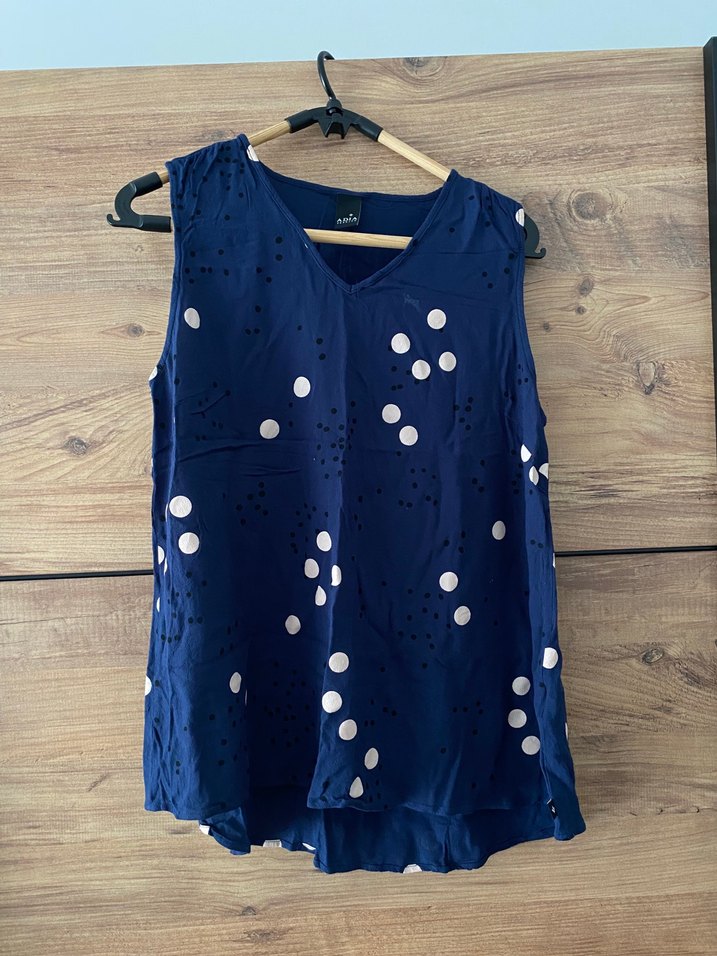 Kolsuz, V yaka ve bol kesim lacivert batik desenli bluz. düğmeli ve midi boy, günlük rahat kullanıma uygun.