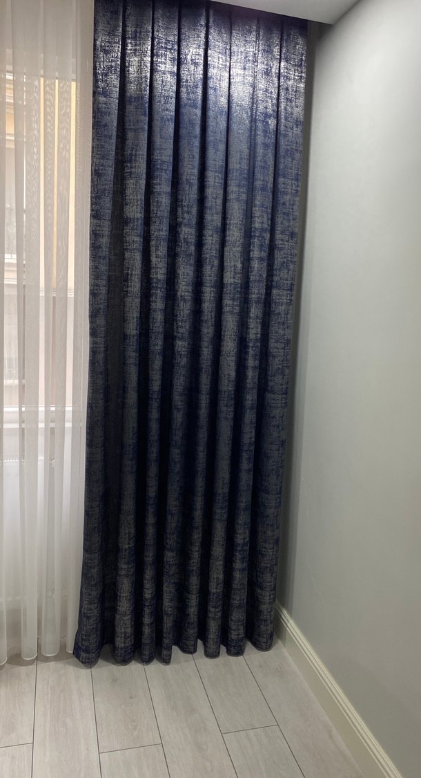 Lacivert renkli, gri tonlarda batik desenli modern perde, mekâna derinlik ve şıklık katar. Perdeci Ali boy 246 cm pileli en 75 cm