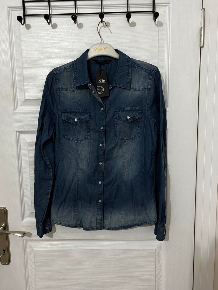 Lacivert renkte, uzun kollu ve yakalı denim gömlek. Düğmeli ön kısmı ve hafif batik deseni ile günlük kullanıma uygun.
