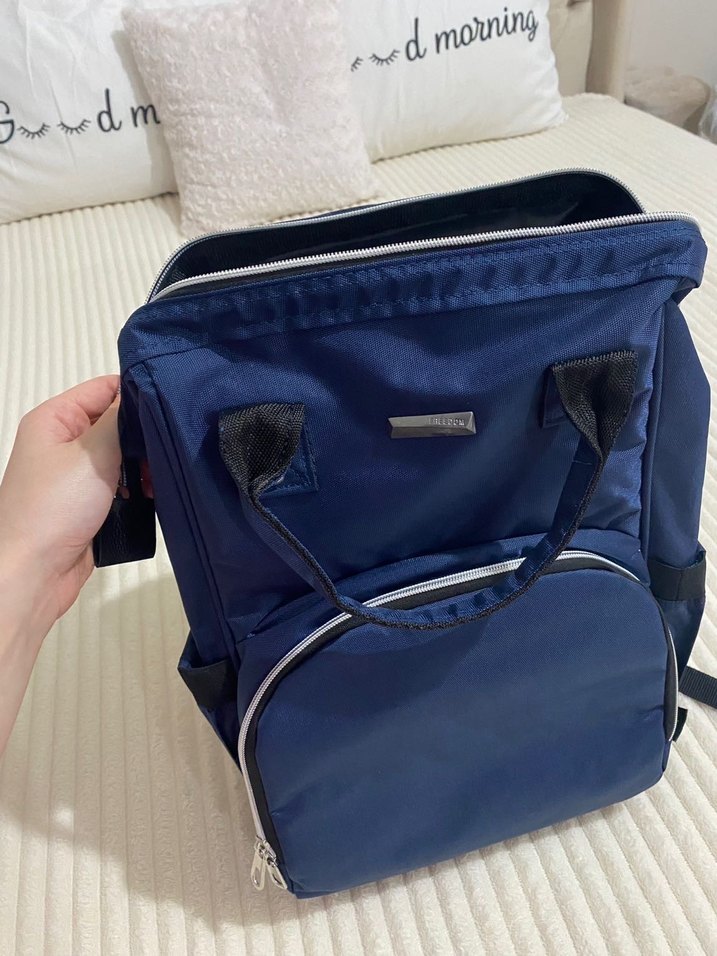 Lacivert ve gri detaylı, çok bölmeli, dayanıklı saplı bebek bakım çantası. Kullanılmadı