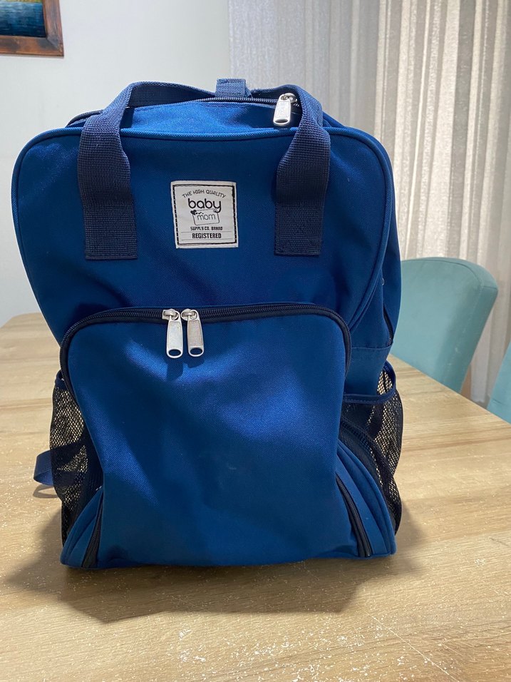 Çok bölmeli, file yan cepli lacivert bebek çantası. Dayanıklı kulpları ve ön fermuarlı cepleri bulunur. Tertemiz hiçbir sorunu yok yeniden farksız