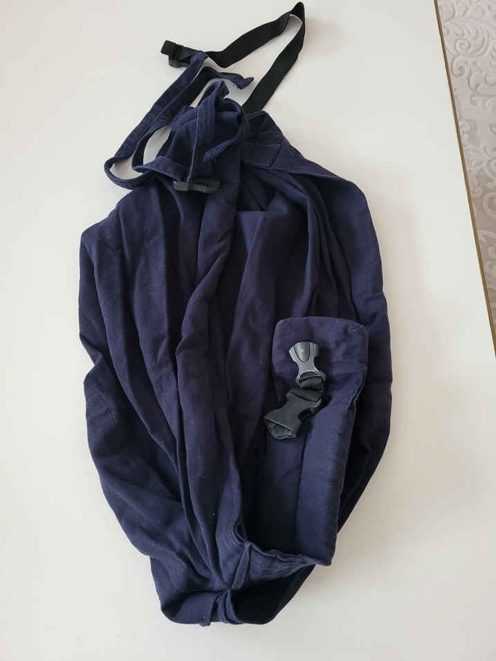 Lacivert renkli bebek taşıma slinginde ayarlanabilir askılar ve güvenli tokalar bulunur. Yumuşak kumaştan yapılmıştır, kullanımı rahattır.