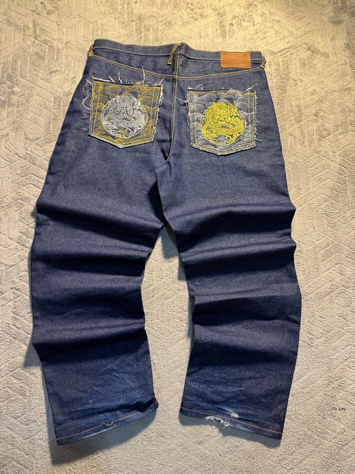 için lacivert renkte, bol kesim ve kemer detaylı denim jean. Sırt ceplerinde işlemeli desenler bulunur. Rahat sokak stili için uygundur.