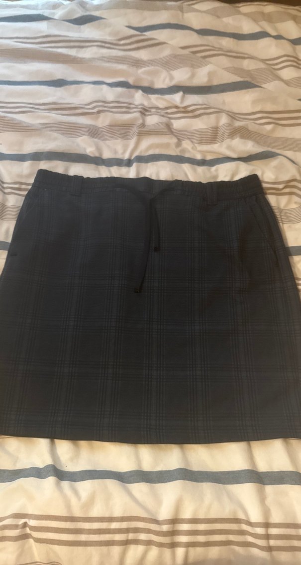 Lacivert renkte, sentetik kumaştan yapılmış, beli bağcıklı ve rahat kesime sahip midi kadın eteği.