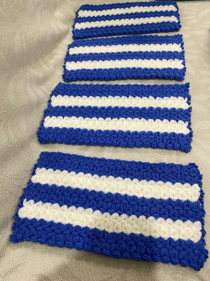 Mavi ve beyaz çizgili, dokulu yüzeye sahip banyo süngerleri. Yumuşak ve renkli, ferahlatıcı bir banyo deneyimi sunar. El emeği lacivert beyaz ve açık mavi krem çizgili lifler tanesi 200 ₺ lifler