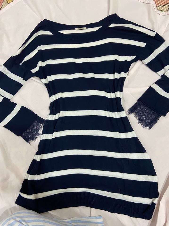 Lacivert ve beyaz çizgili, dantel detaylı uzun kollu, tekne yaka ve midi boyda, dar kesim triko. Günlük kullanıma uygun.