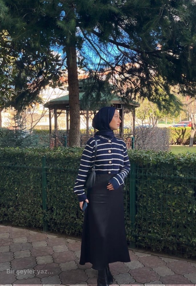 Lacivert ve beyaz çizgili, düğmeli, yuvarlak yakalı, uzun kollu ve midi boyda rahat kesim bir kadın hırkasıdır.