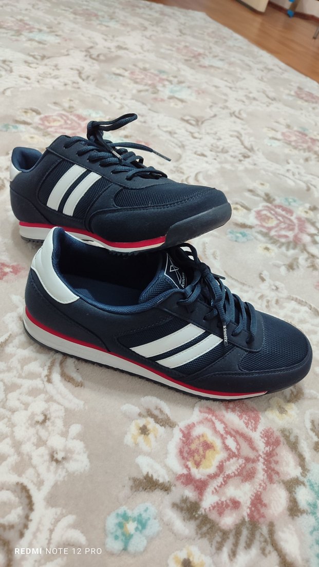 Lacivert beyaz çizgili Erkek spor ayakkabısı, kauçuk tabanlı ve bağcıklı. Sokak stili ve spor şıklığı için uygun. yeni gibi sadece bir kez kullanıldı