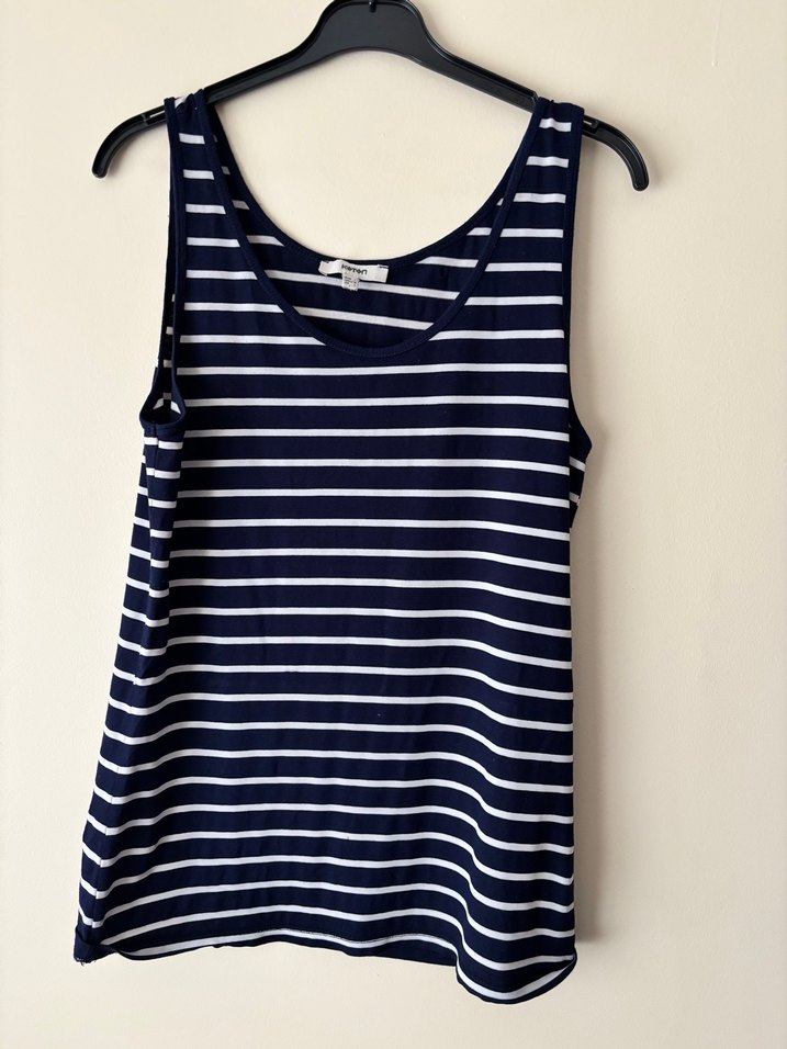 Lacivert ve beyaz çizgili, salaş kesim kadın atlet, kayık yaka ve kolsuz tasarımla günlük rahat kullanım için yumuşak sentetik kumaştan üretilmiştir.