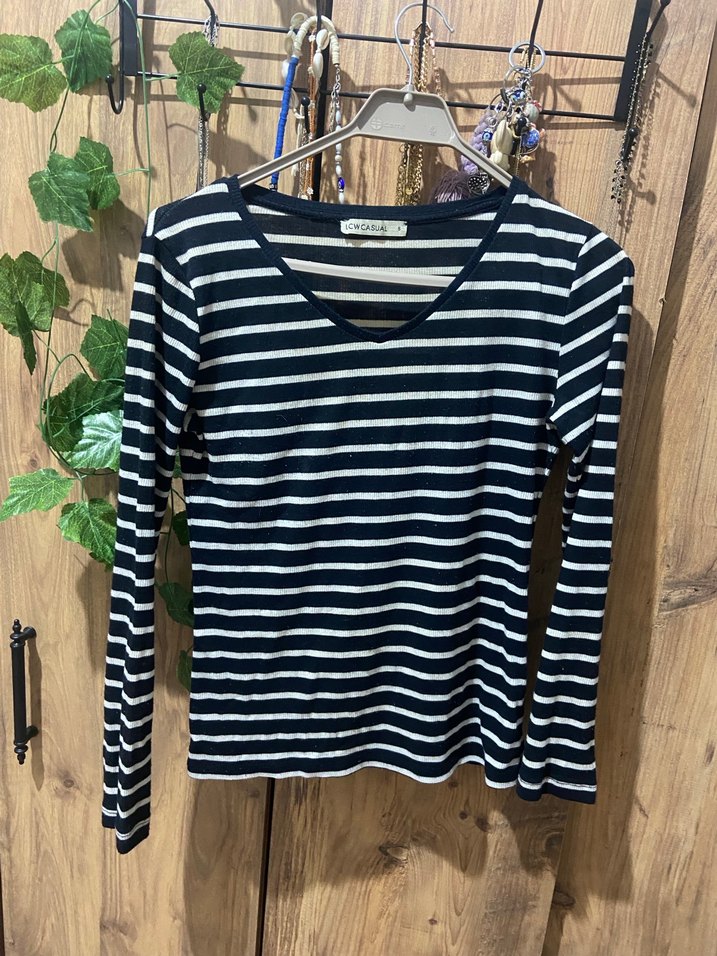 Lacivert ve beyaz çizgili, pamuklu kumaştan üretilmiş, uzun kollu ve bisiklet yaka kadın tişörtü. Günlük ve şık bir sokak stili sunar.
