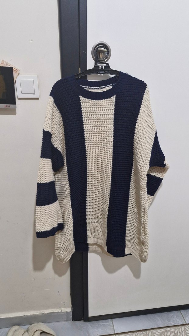 Bu örgü kazak, uzun kollu ve bisiklet yaka olup, koyu lacivert ve beyaz çizgili deseniyle bol kesimdir. Günlük kullanıma uygundur. Kalçanın altina iniyor boyu
