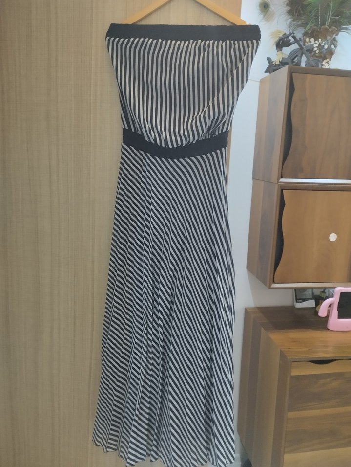 lacivert beyaz çizgili sentetik kumaştan,tül straplez ve pile detaylı, vücuda oturan uzun elbise içi astarlidir