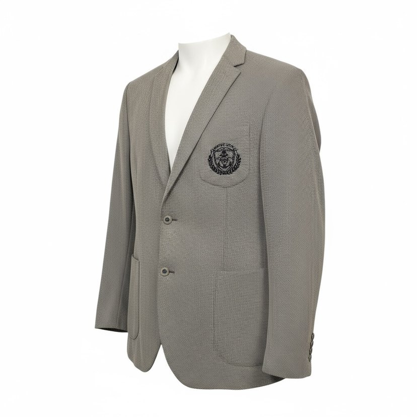 Lacivert beyaz erkek ceketi, düğmeli ve işlemeli detaylara sahip, modern klasik tarzda ve iş ortamına uygun regular fit uzun kolludur. Sentetik kumaştan üretilmiştir.