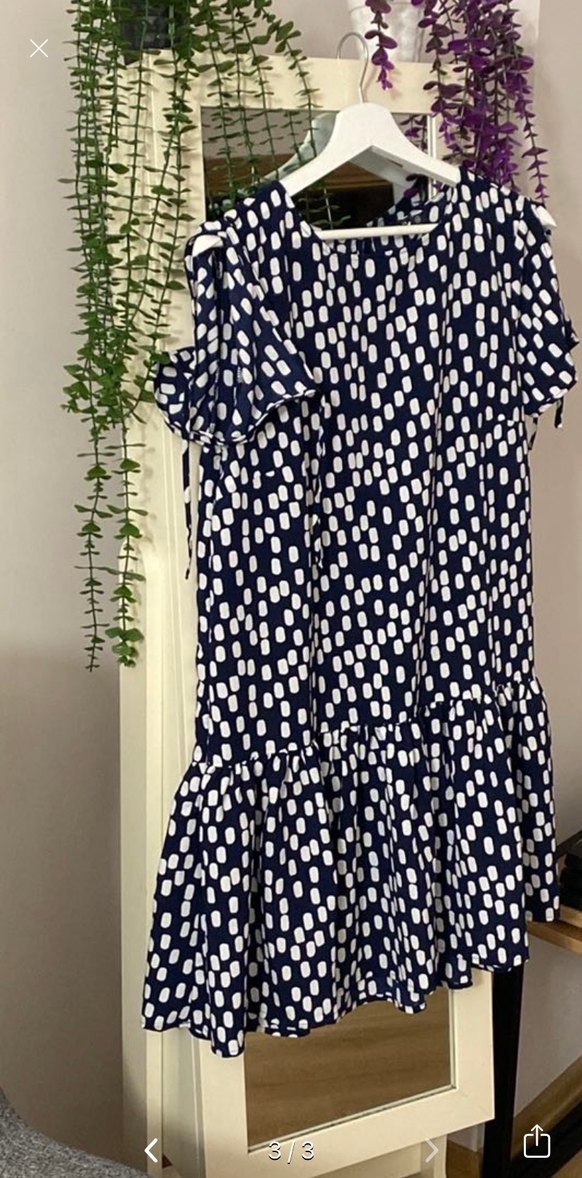 Lacivert zemin üzerine beyaz puantiyeler, bol kesim, kısa ipli kollar ve tekne yaka detaylı kısa bohem tarzda sentetik kumaş elbise.
