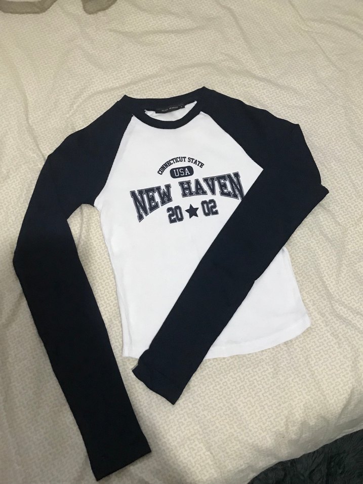New Haven baskılıdır. Yuvarlak yaka ve pamuklu örme kumaştan yapılmıştır. vücudu sarar. fotoğrafta pek belli olmamış ama lacivertin güzel bi tonudur. hiç giyilmedi.