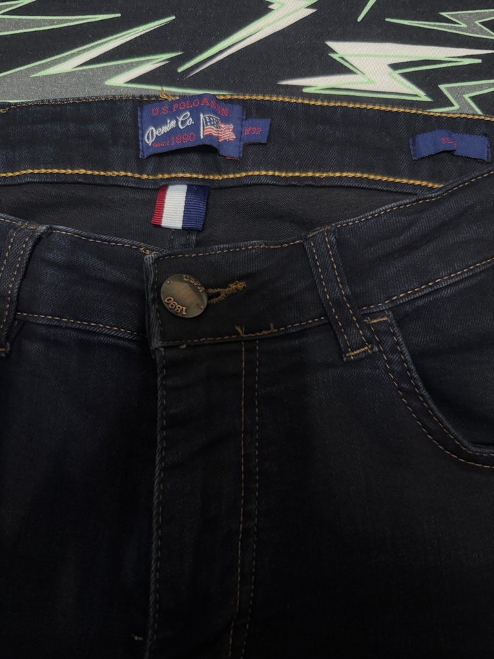 Düğmeli, düz kesim ve baskılı lacivert kot pantolon, midi boyda günlük rahat kullanım için uygundur. En 40 cm boy 97 cm