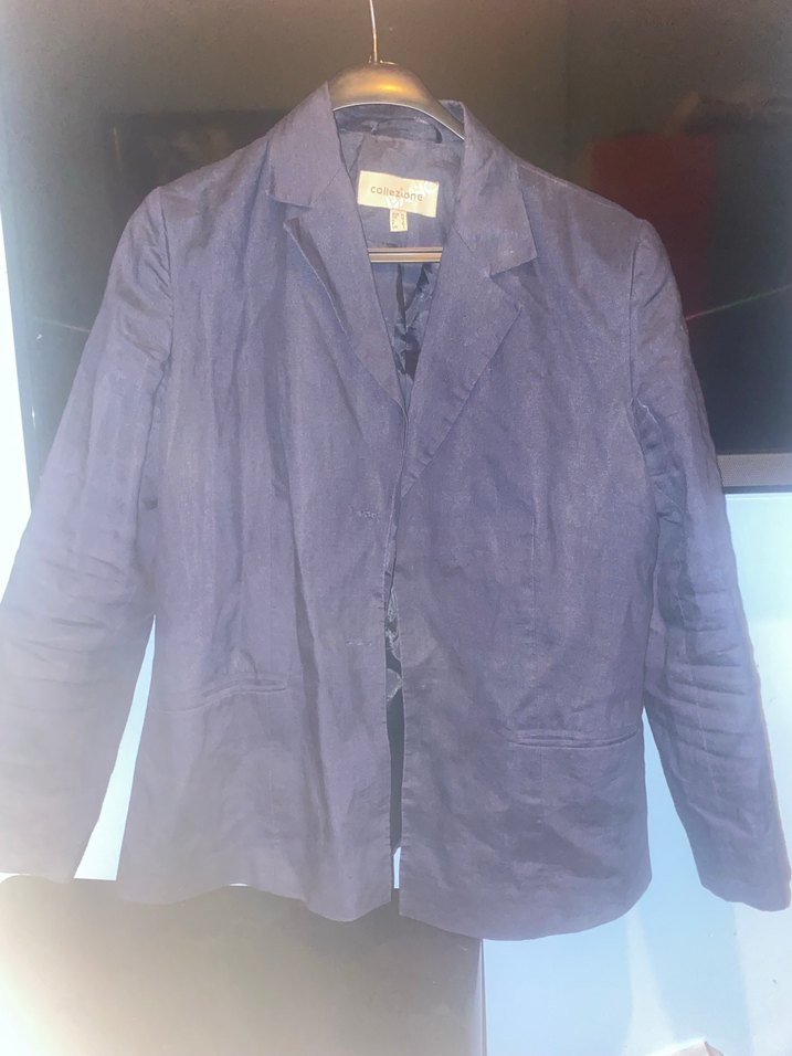 Keten kumaştan, notched lapel yakalı, düğmeli, uzun kollu kadın blazer ceket. Normal midi boy ve rahat kesimle iş ortamına uygun şık bir modeldir.