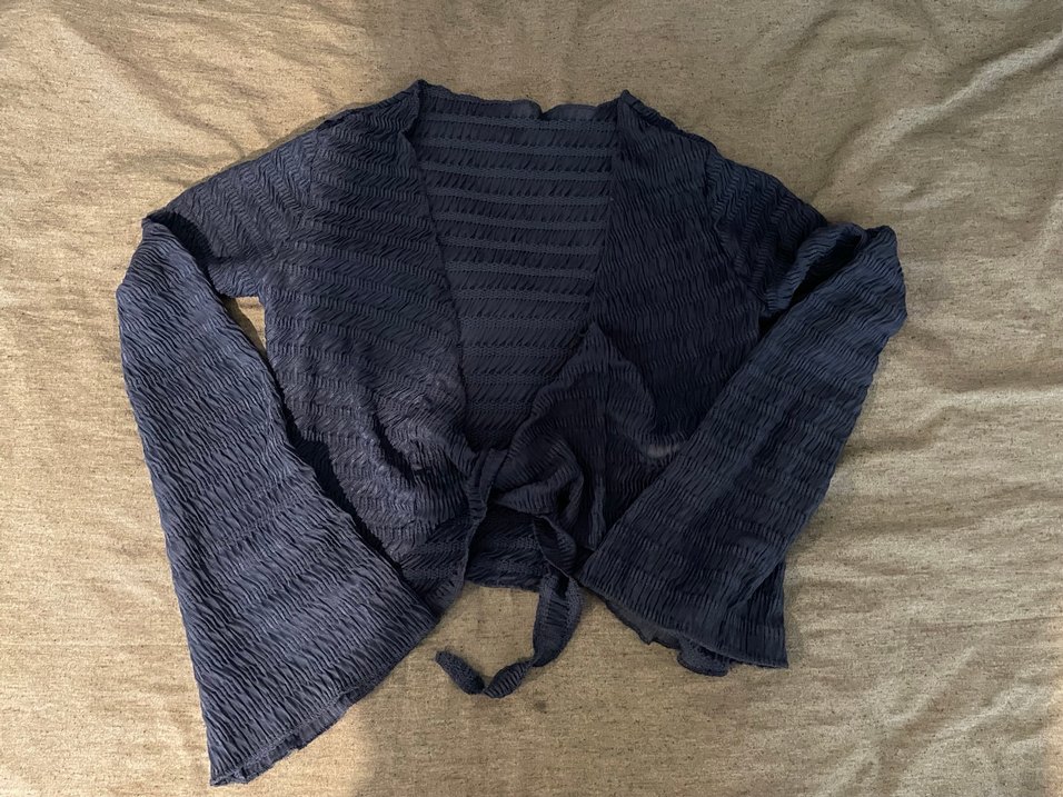 Keten kumaştan, koyu renkte, pliseli dokulu kadın balero Önden bağlamalı, rahat ve bohem tarzda, trend günlük kullanıma uygun.