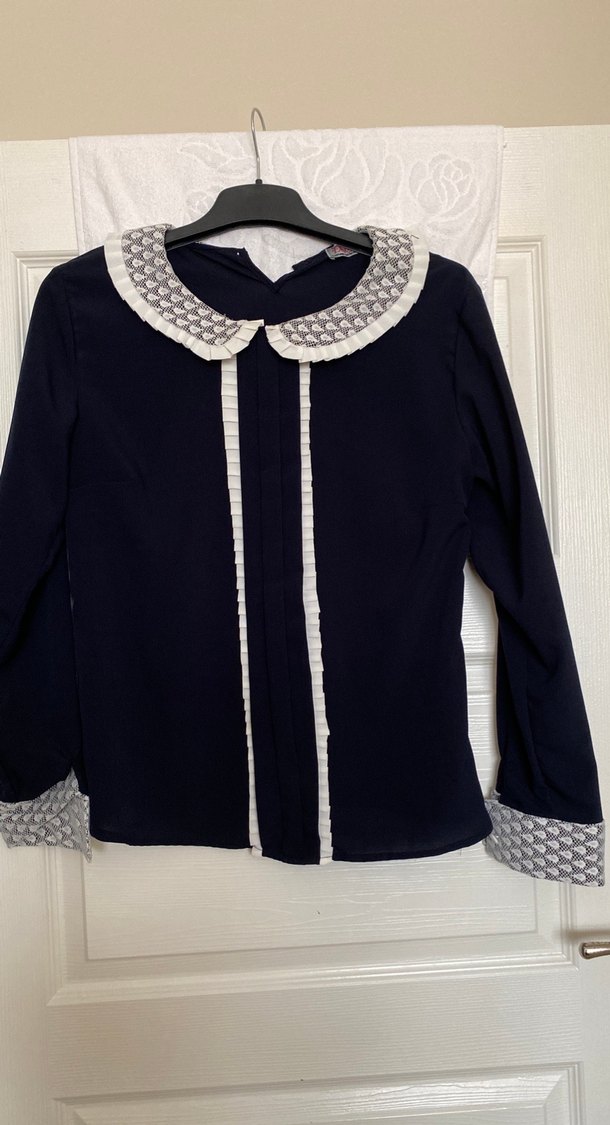 Lacivert bluz, yakasında ve önünde pile detaylar, uzun kollu ve klasik goth tarzıyla sade bir şıklık sunar..ş