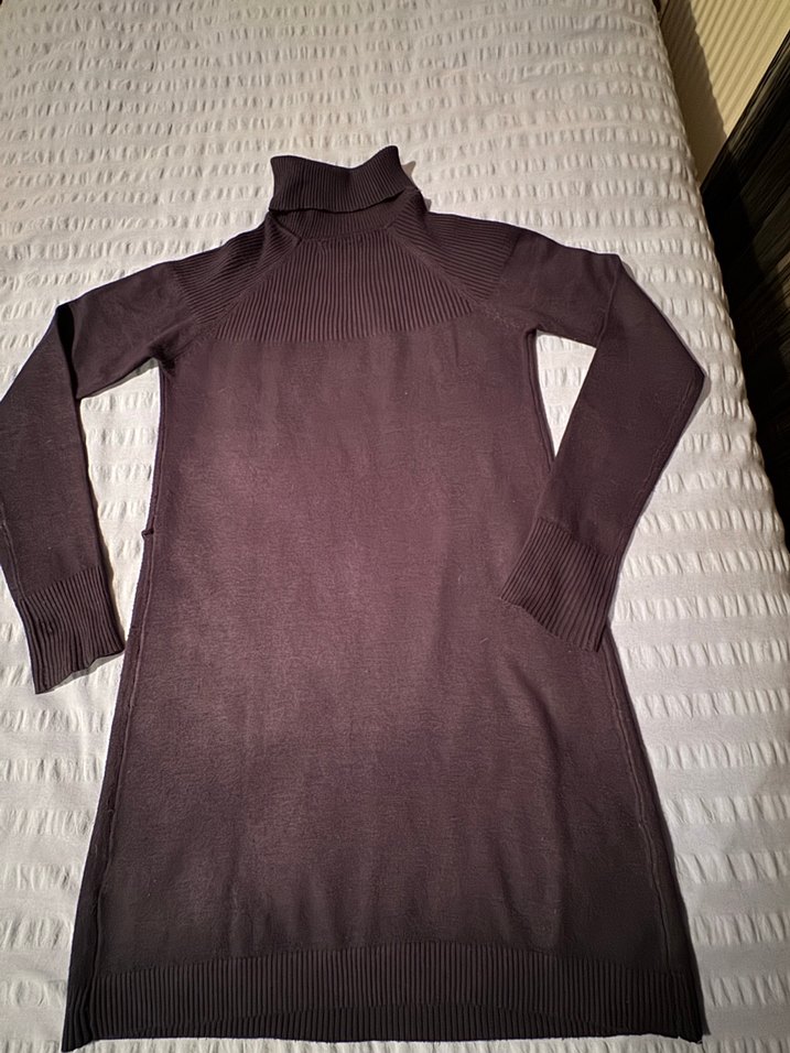 Lacıvert bogazlı uzun ince kazak. Kol uclarında dugme detaylı