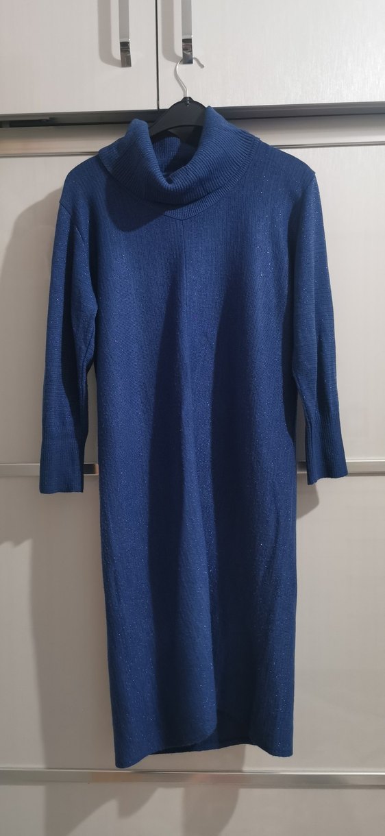 Lacivert renkte, boğazlı ve uzun kollu, yumuşak yün triko elbise. Rahat kesimi ve parlak dokusuyla günlük kullanıma uygundur.