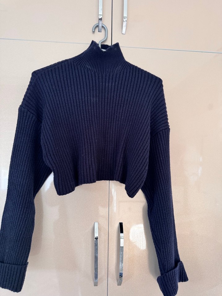 Lacivert örgü kumaştan, boğazlı ve uzun kollu, normal boyda, salaş kesimli kadın kazak. Günlük kullanıma uygun sade ve rahat stil sunar.