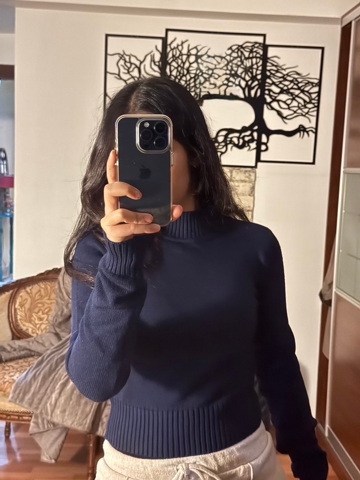 Lacivert boğazlı kadın kazağı, yumuşak yün dokusuyla triko örülüdür. Uzun kollu, vücuda oturan ve normal boydadır, rahat ve şık bir tercihtir.