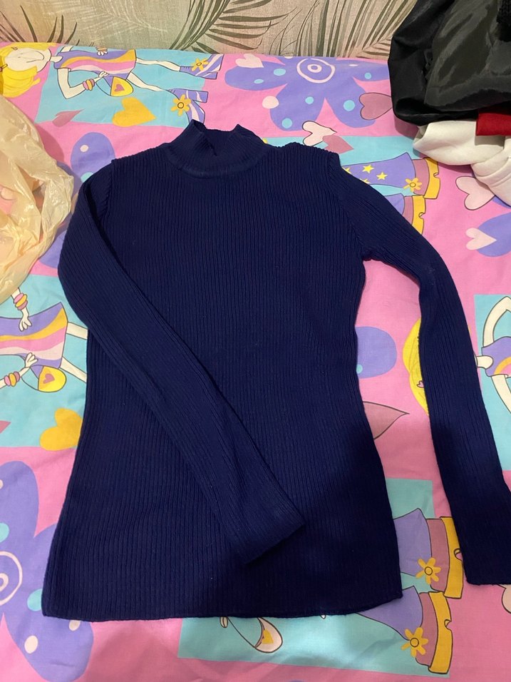 Lacivert boğazlı ve uzun kollu, vücuda oturan triko kadın kazak. Yumuşak, rahat örme kumaştan, normal midi boyda, günlük kullanım için uygun.