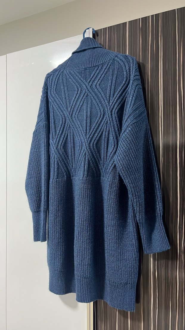 Lacivert renkte, boğazlı ve uzun kollu, bol kesim örme kadın kazak. Rahat ve gündelik kullanım için midi boyda, desensiz ve dokulu triko detaylara sahip. Vesna dan alındı, hiçbir sorunu yok #vesna