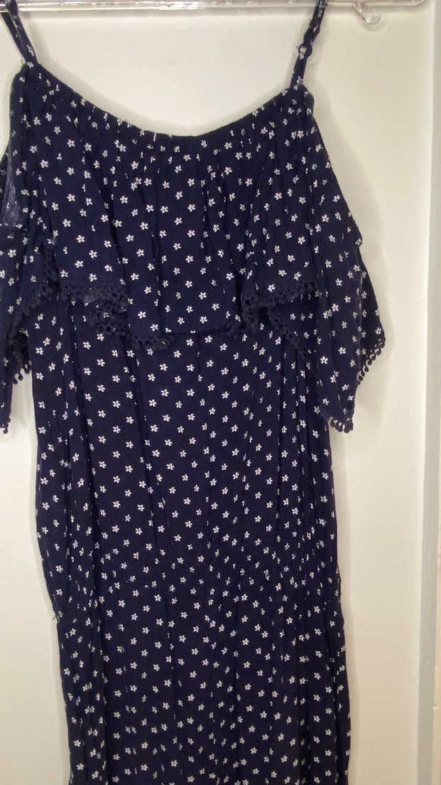 Lacivert uzun pamuk tulum, bol kesim ve kısa kollu. Kayık yaka ve fırfır detaylı, bohem etnik desenli.