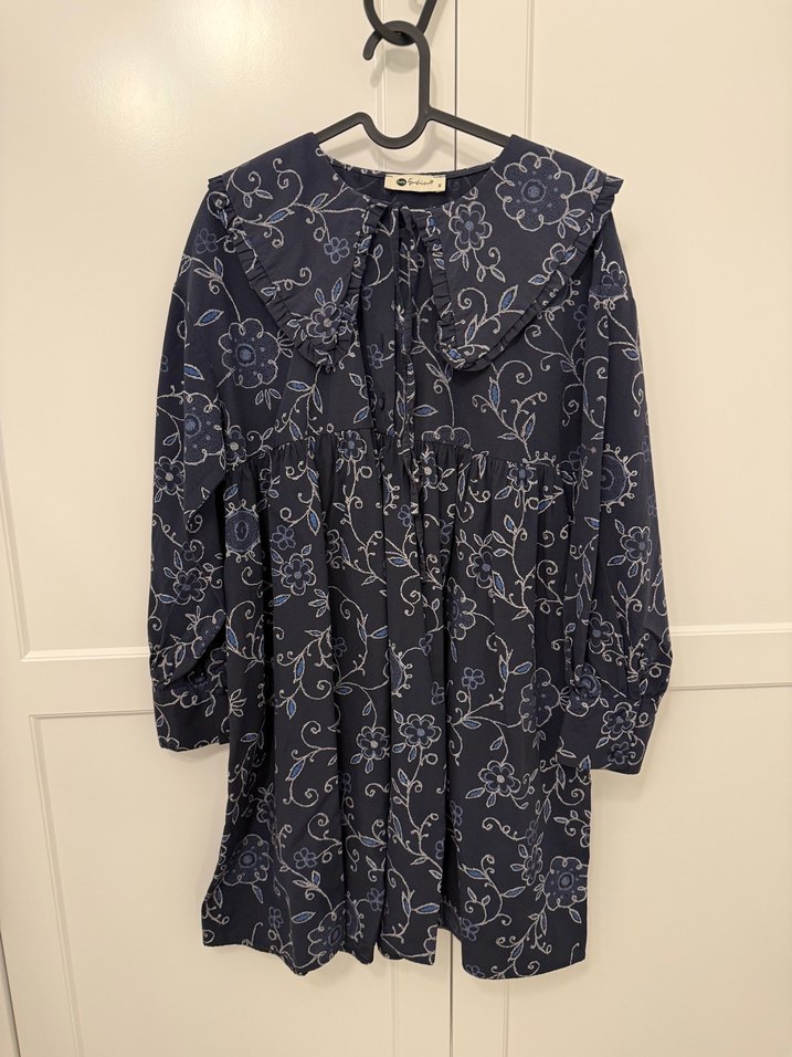 Lacivert bluz, bol kesim, yakalı ve uzun kolludur. Bohem tarzda, fırfırlı ve bağlama desenlidir, günlük kullanıma uygundur.