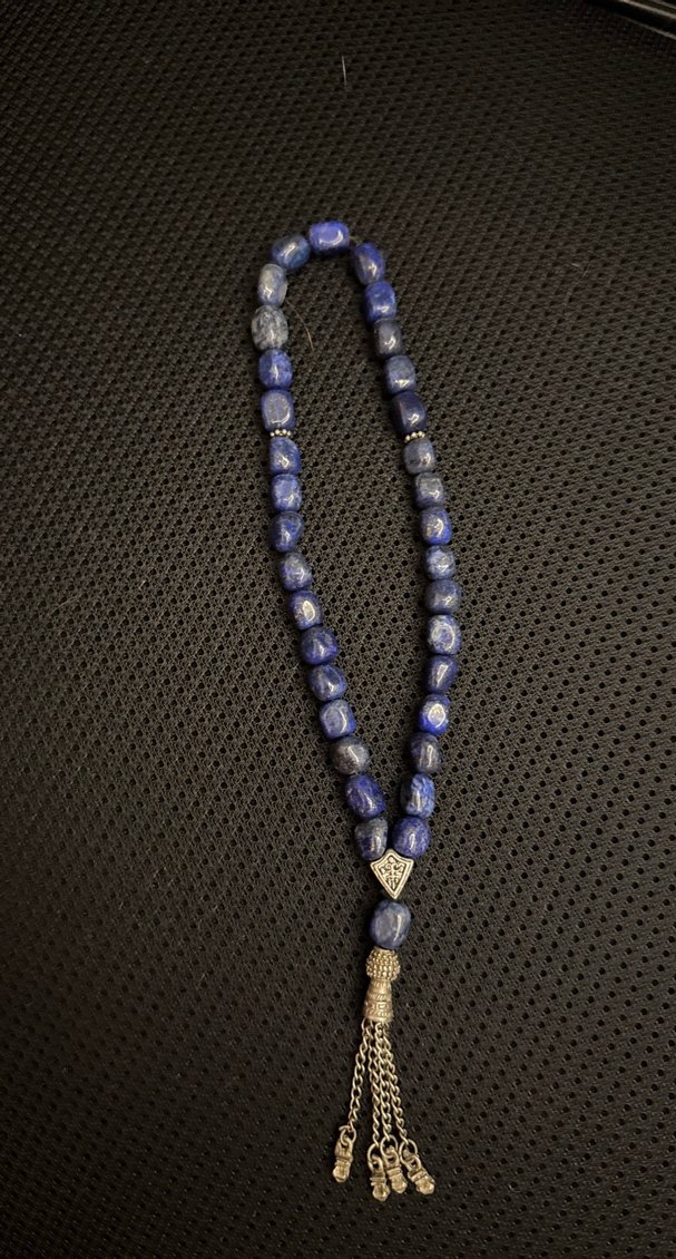 Lacivert bohem tarzda erkek tesbih, üçgen figür ve püskül detayıyla. Boncuklar koyu ve canlı renktedir.