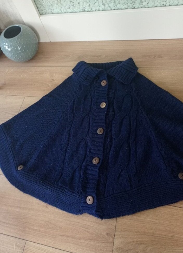 Lacivert örgü kadın pelerin, bohem tarzda, bol kesim, boğazlı yaka ve uzun kolludur. Düğmeli önü ve midi boyu ile rahat kullanım sunar.
