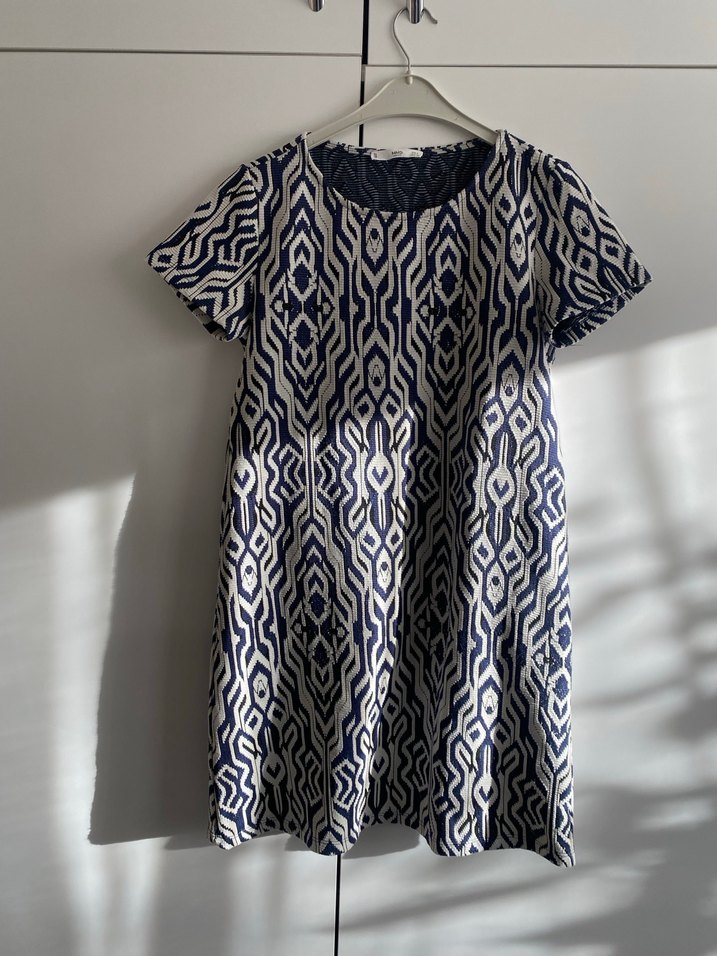Lacivert ve gri tie-dye desenli, kısa kollu, tekne yakalı, bol kesim, pliseli hamile tunik. Midi boyda, günlük kullanıma uygun.